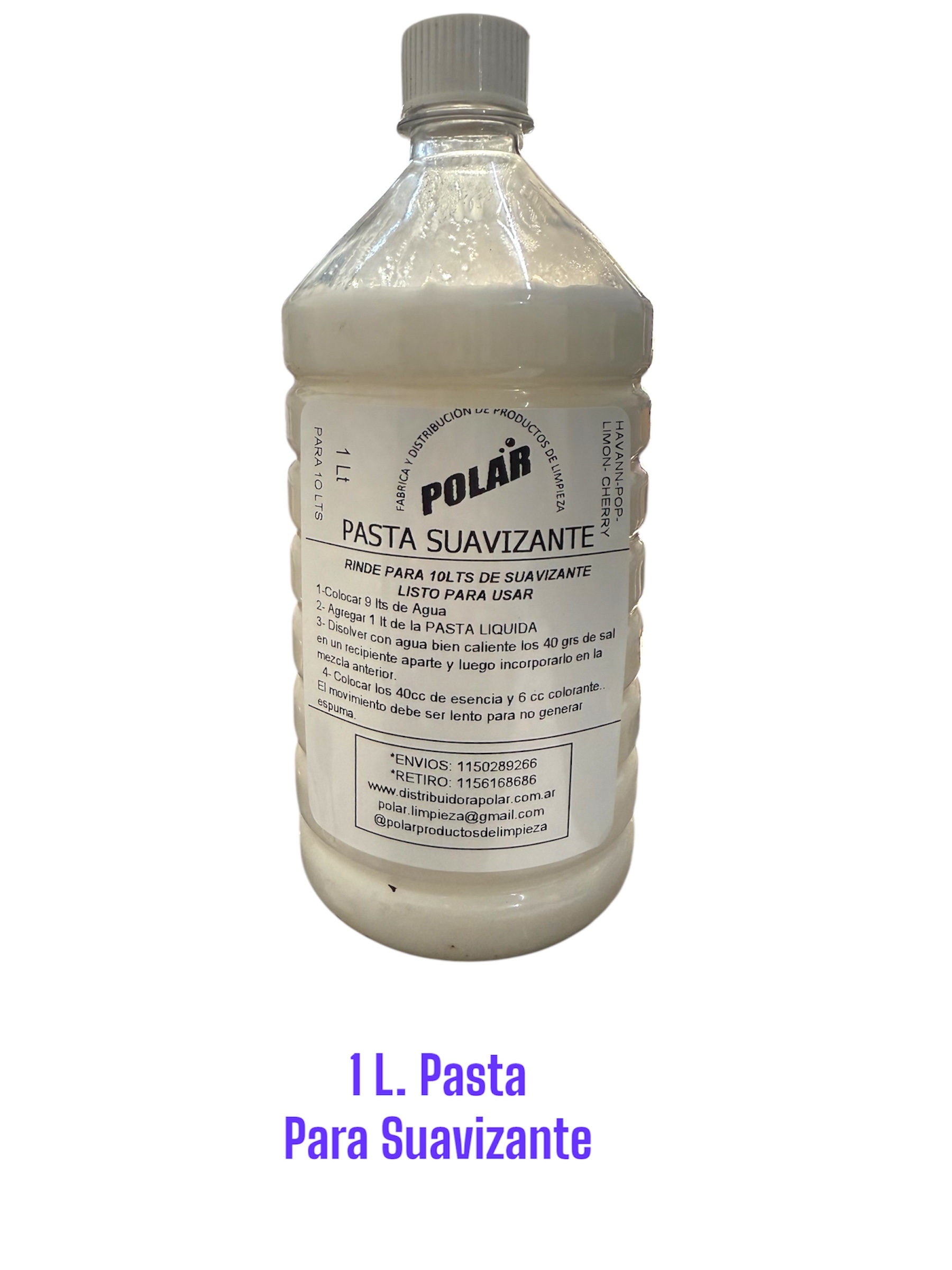 1 lt de PASTA de Suavizante rinde 10 lts de Suavizante listo para usar + 6 cc colorante + 40 cc de esencia + 40grs sal: 1 botella de 1 litroCódigo: PSZ1-1